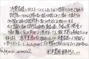 粟津農園で特に力を入れて育てている野菜のひとつ、九条ネギ。奈良時代より1300年以上の歴史をもつ伝統野菜です。九条ネギは最短で種まきから約2~3か月後に収穫が可能ですが、粟津農園では10か月以上かけて栽培しています。「半年ほどかけてしっかりと成長させてから、一度引いて干し苗にし、それを再び植え付けて育てていくという方法です。古くから続いている伝統の方法で栽培することで、本当の九条ネギというものを感じてもらえたら、と思います」