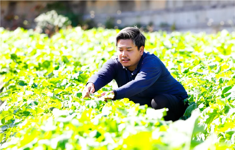 代々続く農家で、幼い頃から祖父の働く姿を見て育つ。祖父の他界をきっかけに、長年続けてきた家業が途絶えてしまうことへの危機感を抱き、農業に従事することに。現在は九条ネギと米をメインに、完全無農薬レモンなど、周年で約80種の野菜を栽培。九条ネギは、京都市農業協同組合主催の秋季農産物品評会において、2023年度は京文化担い手奨励賞、2024年度は京都市産業観光局長賞を受賞。
