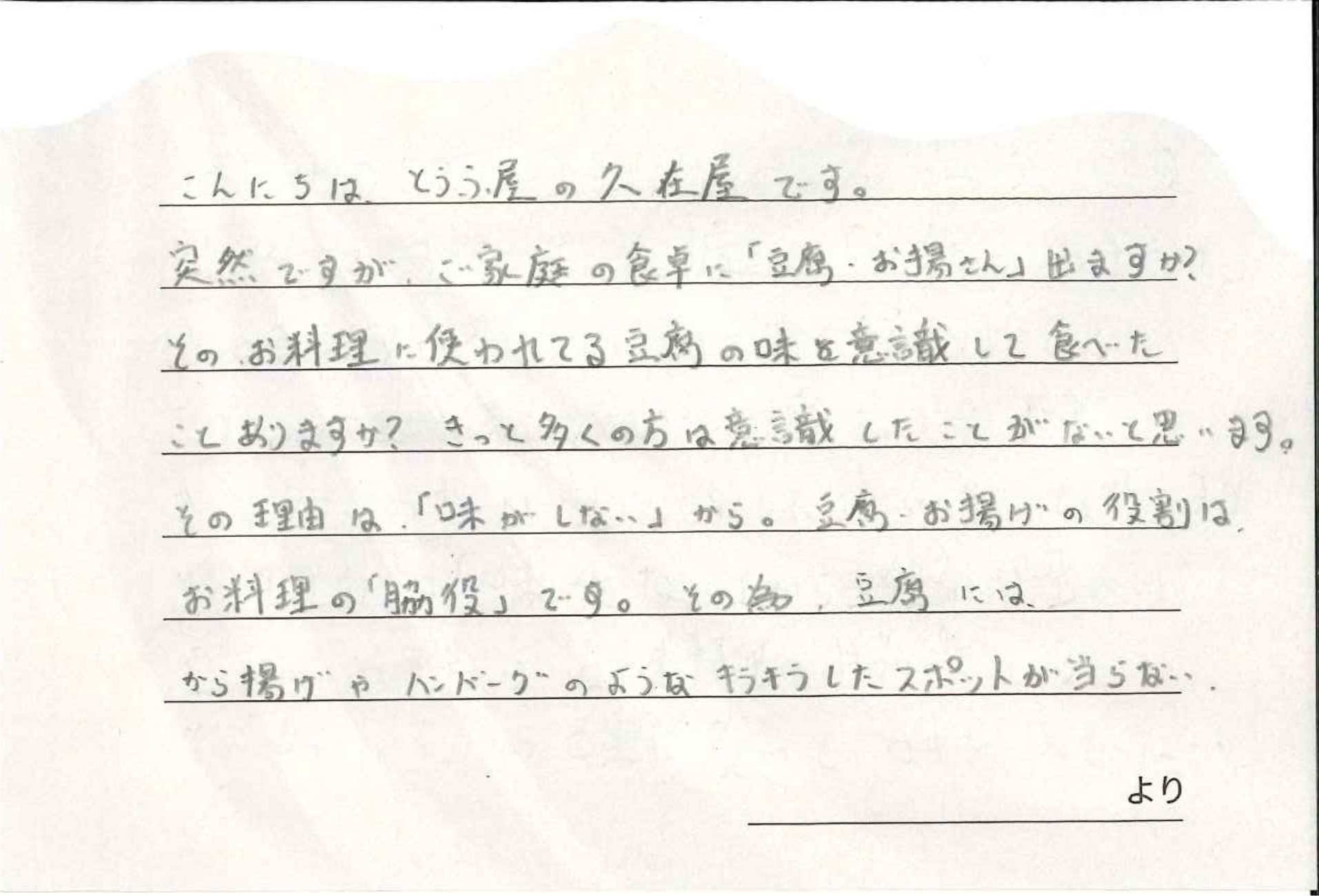 手づくりの技と原料に徹底したこだわりを持ち豆腐づくりを行なう、久在屋。「豆腐の材料は、大豆、にがり、水の3つだけ。このシンプルな素材の味をどう引き出すかが、豆腐づくりの腕の見せどころ」と、東田さんは語ります。久在屋の豆腐づくりに使われる大豆は、日本各地で昔から栽培され続けてきた在来品種。長い年月の中でその土地の気候や風土、栽培法に適応し、独特の味や香りを持っています。そんな希少な在来品種の大豆を全国各地の契約農家から取り寄せ、月替りで使っているそうです。