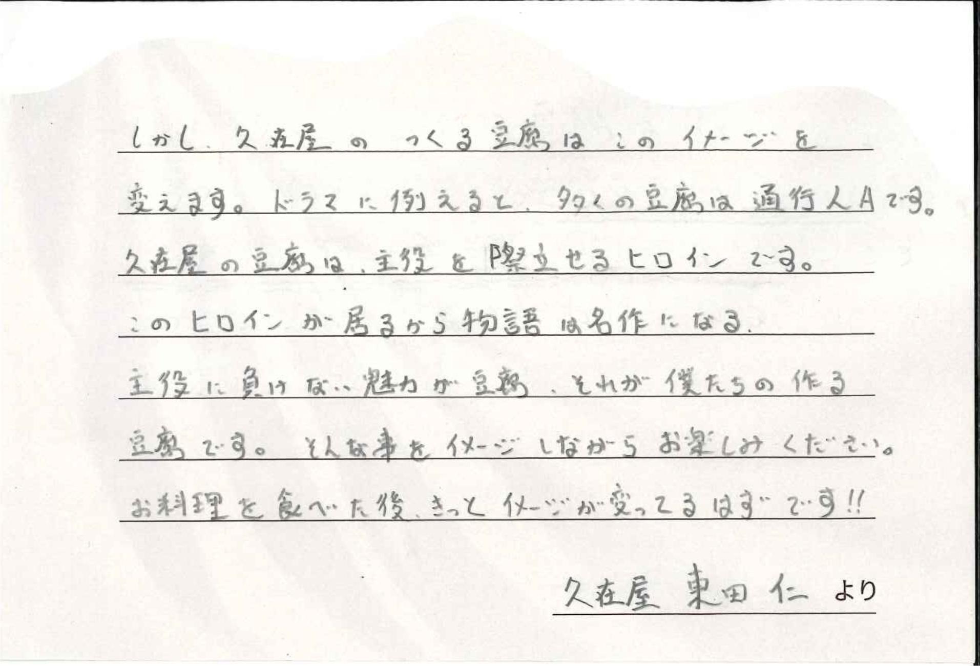 有限会社久在屋 専務取締役および、同社が手がける豆腐スイーツの店「AMAIMON KYUZAYA」製造販売責任者。1987年(昭和62年)創業の久在屋は、日本各地の契約農家の地大豆(在来品種)を使ったオリジナル豆腐ブランド「京の地豆腐」を展開。自社併設店舗での販売のほか、京都タカシマヤなど全国の百貨店や高級食品スーパー、飲食店に豆腐や揚げを卸す。代表職人の東田和久氏は、令和6年度「卓越した技能者(現代の名工)」を受賞。